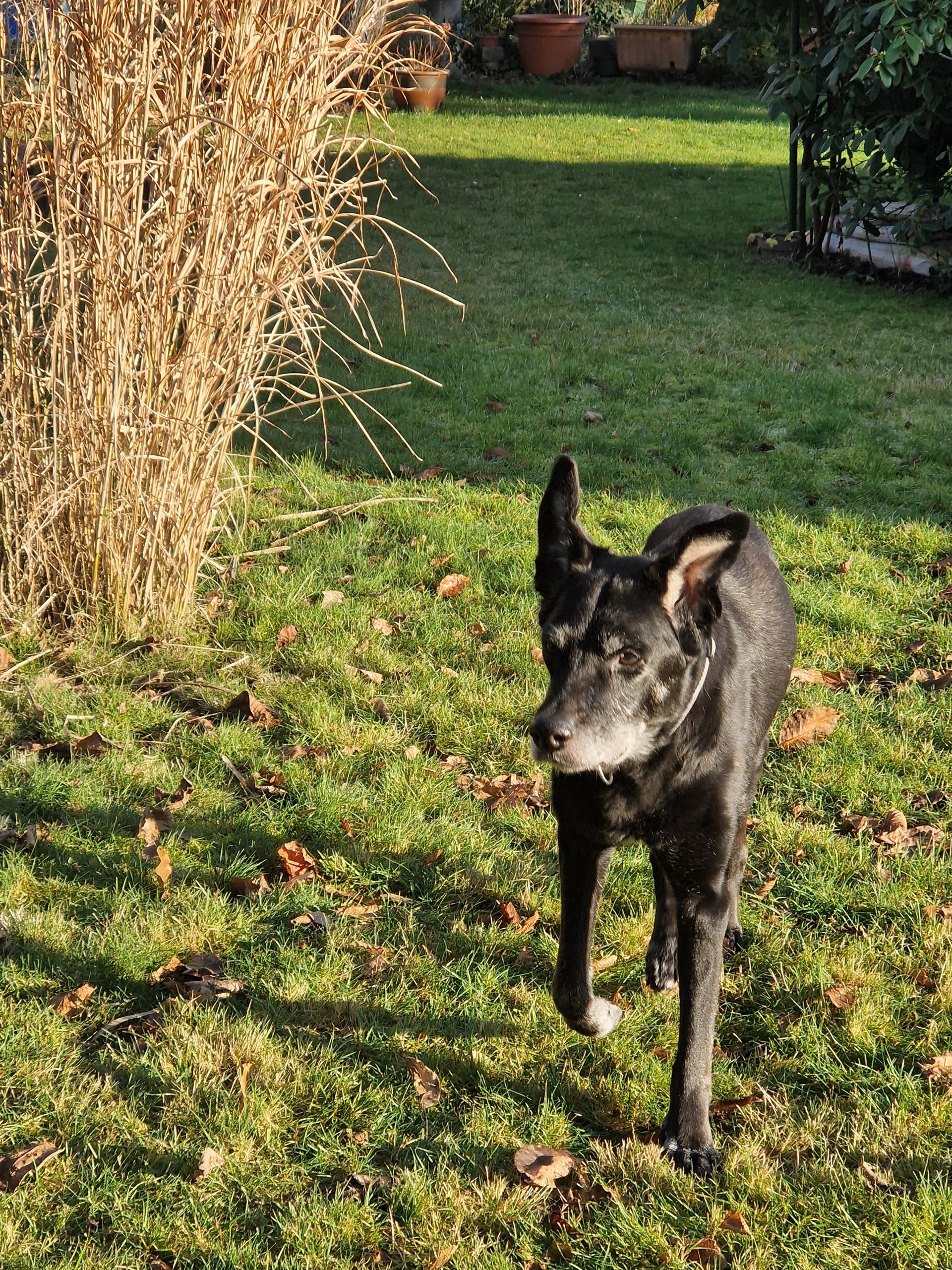 Ich wohne jetzt ohne Treppen und mit einem großen Garten, wo ich mich gerne auf der Wiese aale. Meine Spaziergänge finden im nahen Wald statt, am liebsten mit dem ganzen Rudel. Einmal im Monat besuche ich meine Lieblingstierärztin Frau de Paiva im Tierschutzzentrum, die mich auch nach meinem Auszug aus dem Tierheim betreut. Meine neuen Menschen achten immer genau darauf, dass ich alle meine Medikamente nehme, und helfen mir, wenn ich an manchen Tagen nur ganz schlecht laufen kann oder nicht so richtig essen mag.