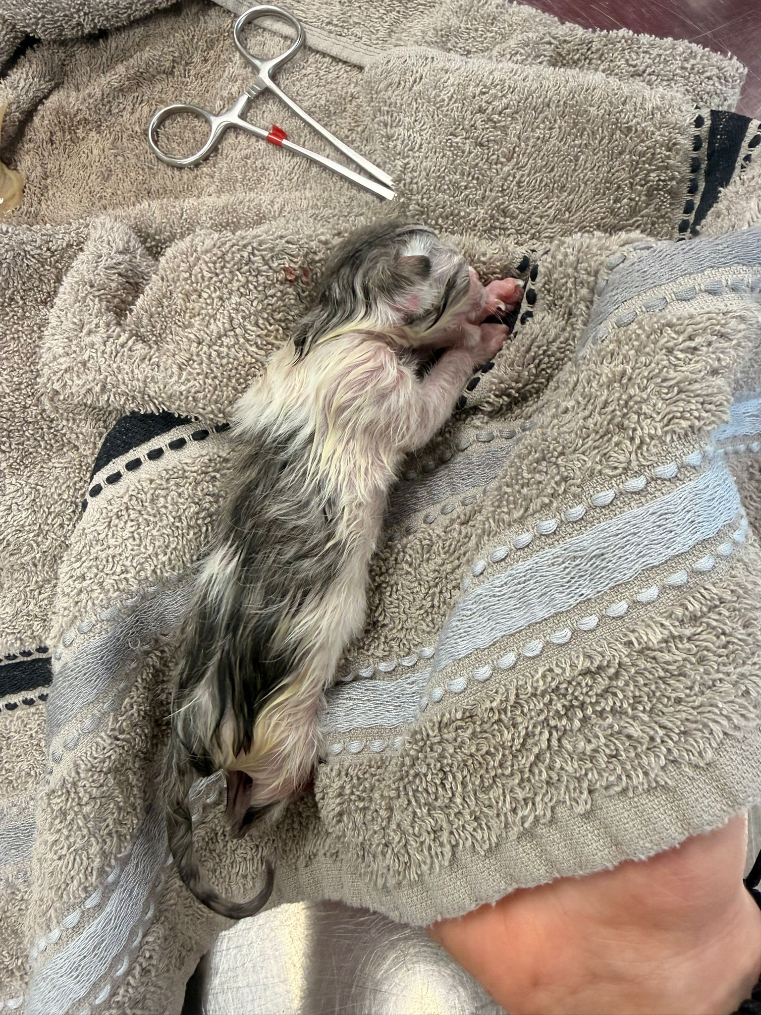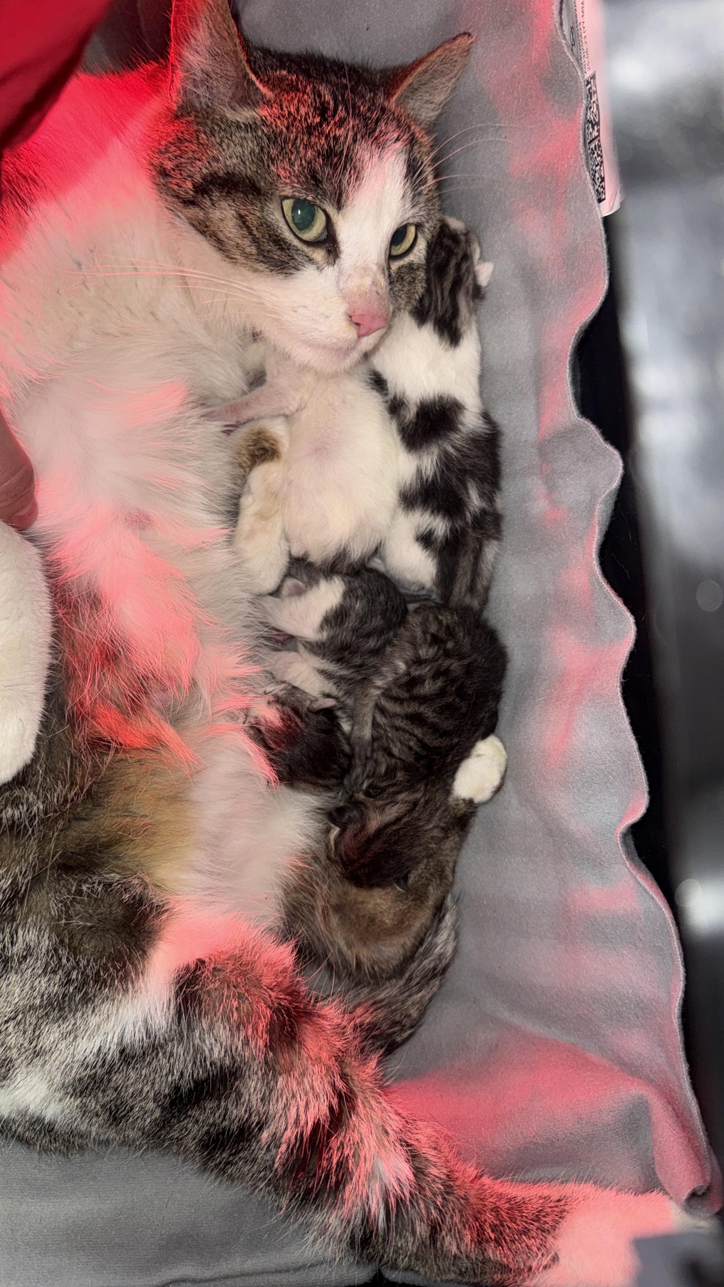 Das vierte Kitten war stabil und suchte sofort die Nähe seiner Mama, die sich liebevoll um ihre Kleinen kümmerte. Kurz darauf traf auch unsere Tierärztin ein und überwachte die Familie intensiv.
