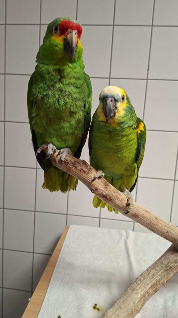 Wir sind Lara, die Gelbwangenamazone, und Bonito, die Blaustirnamazone.